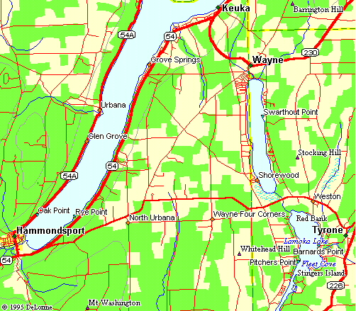 The lake was once chocked with green alge and Eurasian Milfoil, but today the lake is fairly weed free. Waneta is perfect for familys. The shores slope slowly and there are no sharp drop offs. Lamoka is connected to Waneta by a small canal that will soon be navagable by medium size boats. Lamoka has islands and a lot of shoreline. There are several rental options on both lakes, but for the most part the cottage owners are multi generational. It resides in both Schuyler and Steuben Counties. |